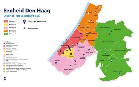 De politie-eenheid Den Haag maakte onlangs bekend dat ze aan de vooravond staat van een grote verandering in de indeling van het werkgebied naar districten en basisteams. Na een voorgenomen herindeling telt de eenheid over enkele jaren nog vijf districten en negentien basisteams, tegenover zeven districten en 28 basisteams nu. Met de nieuwe gebiedsindeling beschikt de politie nog over 41 locaties, tegenover 43 nu. ‘Dit doen wij juist om de lokale verankering in stand te houden’, zegt politiechef Karin Krukkert over de reorganisatieplannen van de eenheid. ‘We lopen er steeds vaker tegenaan dat sommige basisteams in onze eenheid zo klein zijn, dat zij nieuwe taken niet meer op zich kunnen nemen en de roosterdruk van politiemensen onnodig groot wordt.’